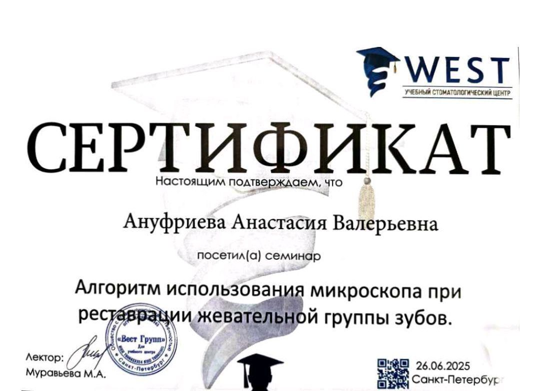 - \"Стоматология терапевтическая\" от 19.06.2023, \"Стоматология общей практики\" от 14.07.2021 Специальность Врач-стоматолог-терапевт\\"Стоматология терапевтическая\" 12.02.2026